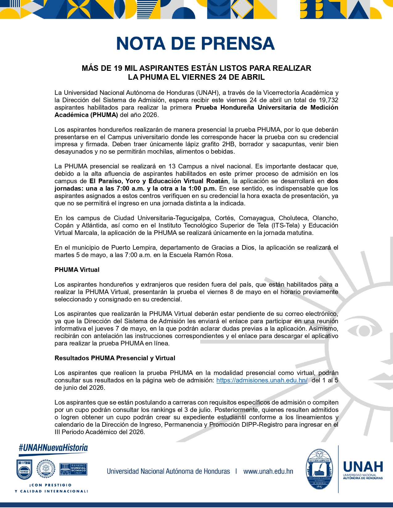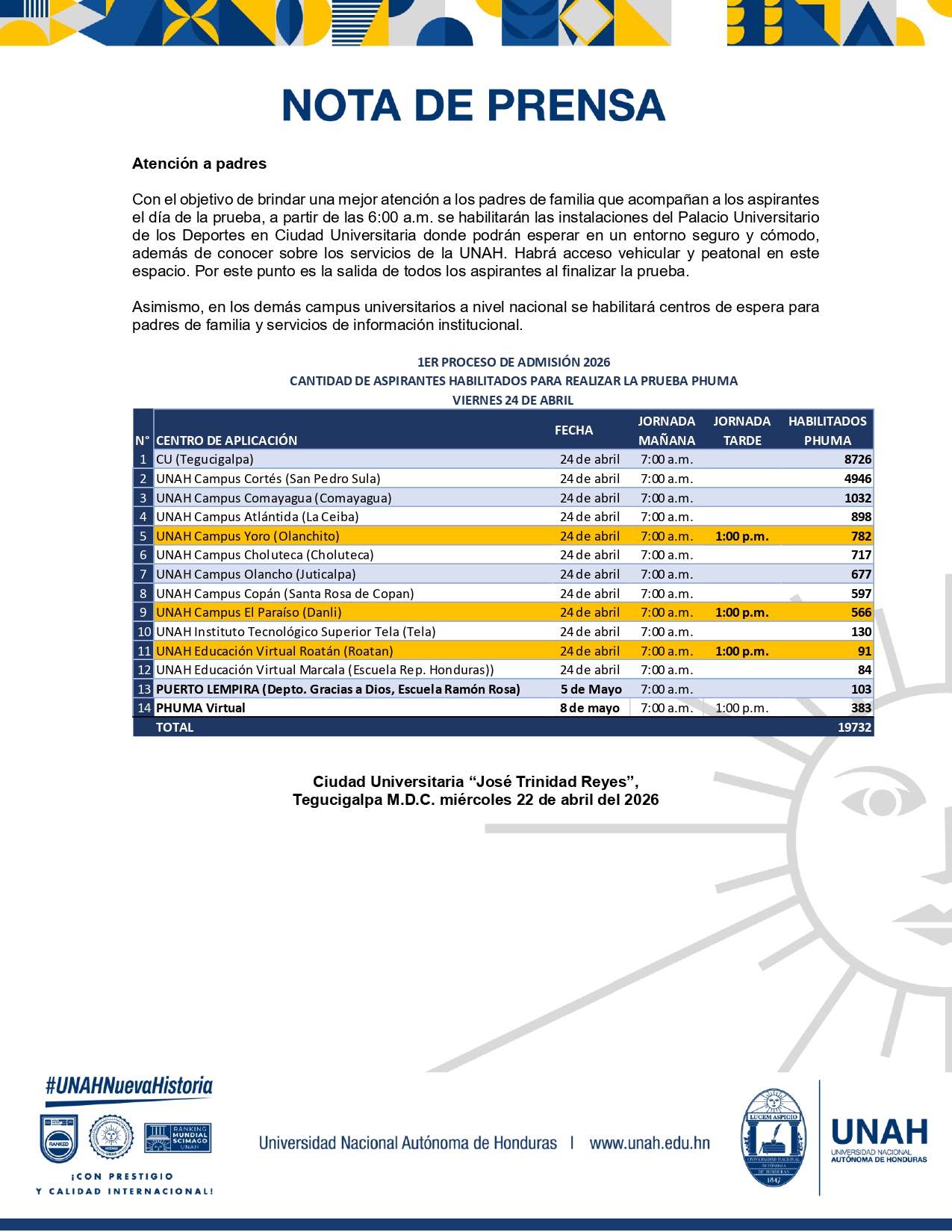 La Universidad Nacional Autónoma de Honduras (UNAH), a través de la Vicerrectoría Académica y la Dirección del Sistema de Admisión, espera recibir este viernes 24 de abril un total de 19,732 aspirantes habilitados para realizar la primera Prueba Hondureña Universitaria de Medición Académica (PHUMA) del año 2026.