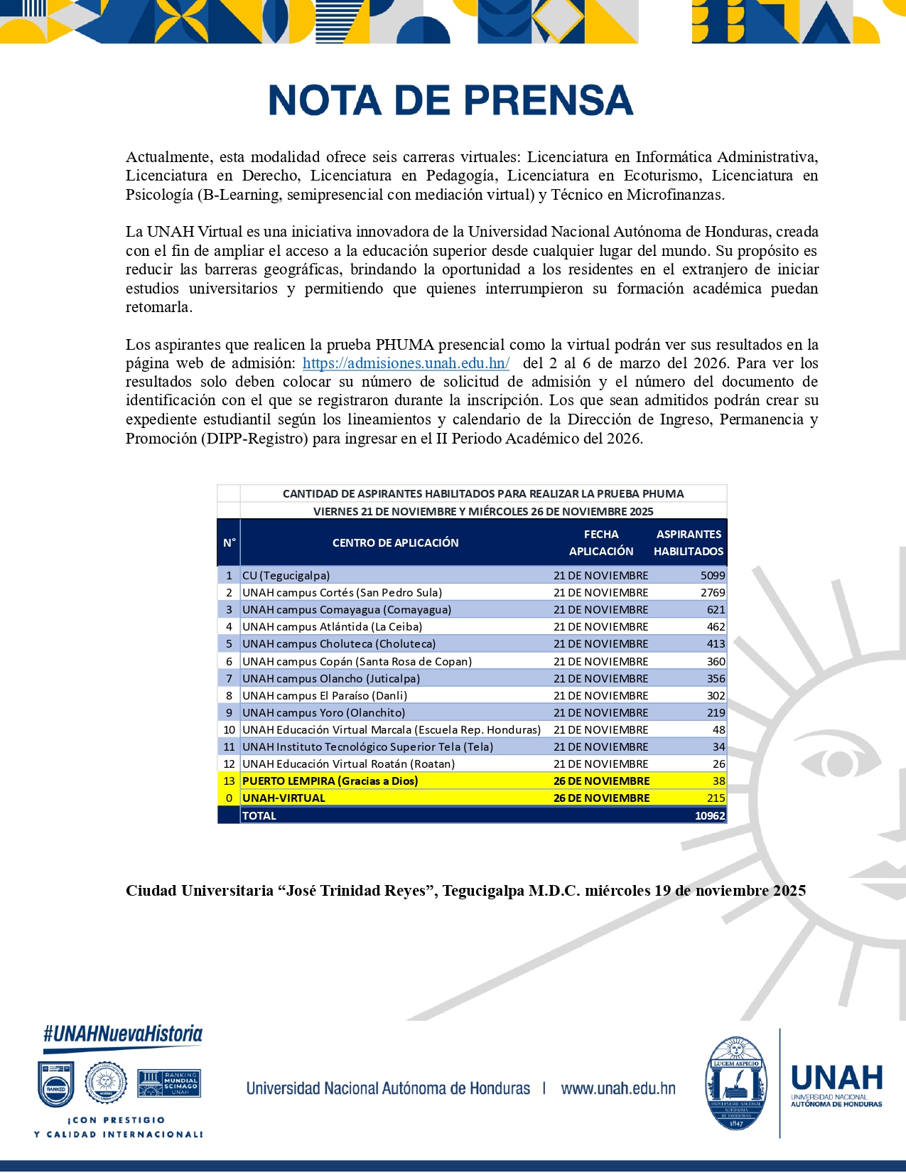 La Universidad Nacional Autónoma de Honduras (UNAH), a través de la Vicerrectoría Académica y la Dirección del Sistema de Admisión, aplicará la tercera Prueba Hondureña Universitaria de Medición Académica (PHUMA) este viernes 21 de noviembre a más de 10,900 aspirantes.