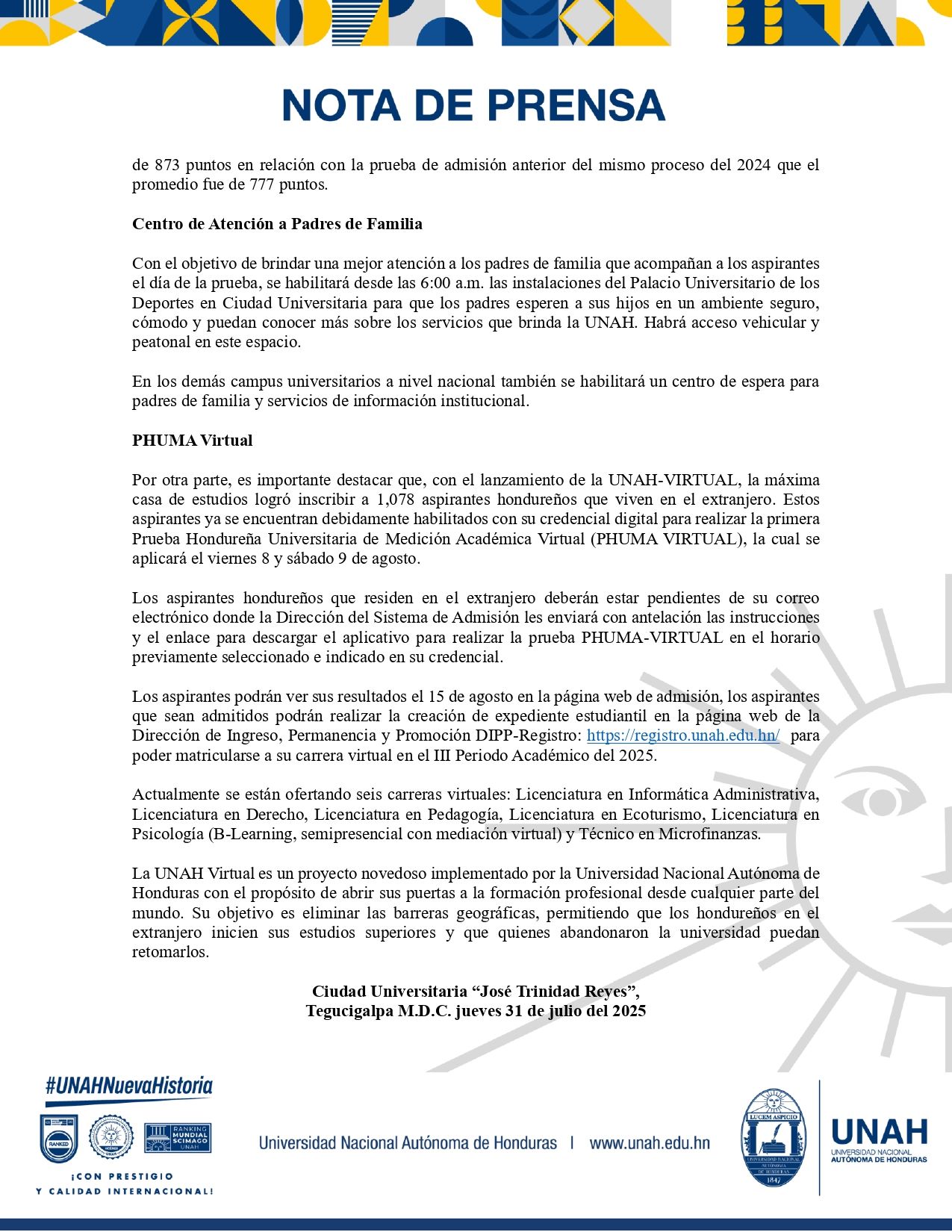 Por otra parte, es importante destacar que, con el lanzamiento de la UNAH-VIRTUAL, la máxima casa de estudios logró inscribir a 1,078 aspirantes hondureños que viven en el extranjero. Estos aspirantes ya se encuentran debidamente habilitados con su credencial digital para realizar la primera Prueba Hondureña Universitaria de Medición Académica Virtual (PHUMA VIRTUAL), la cual se aplicará el viernes 8 y sábado 9 de agosto.