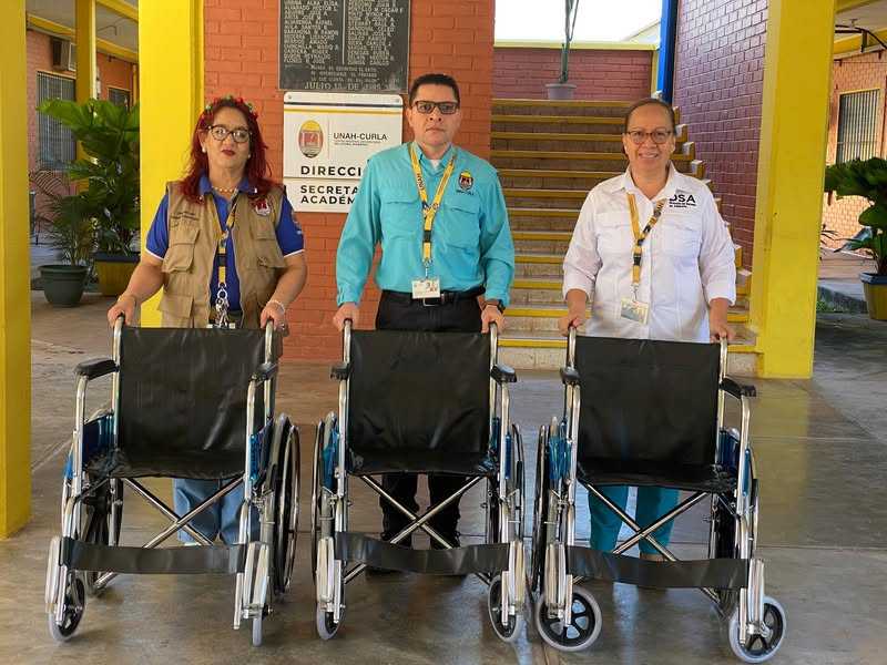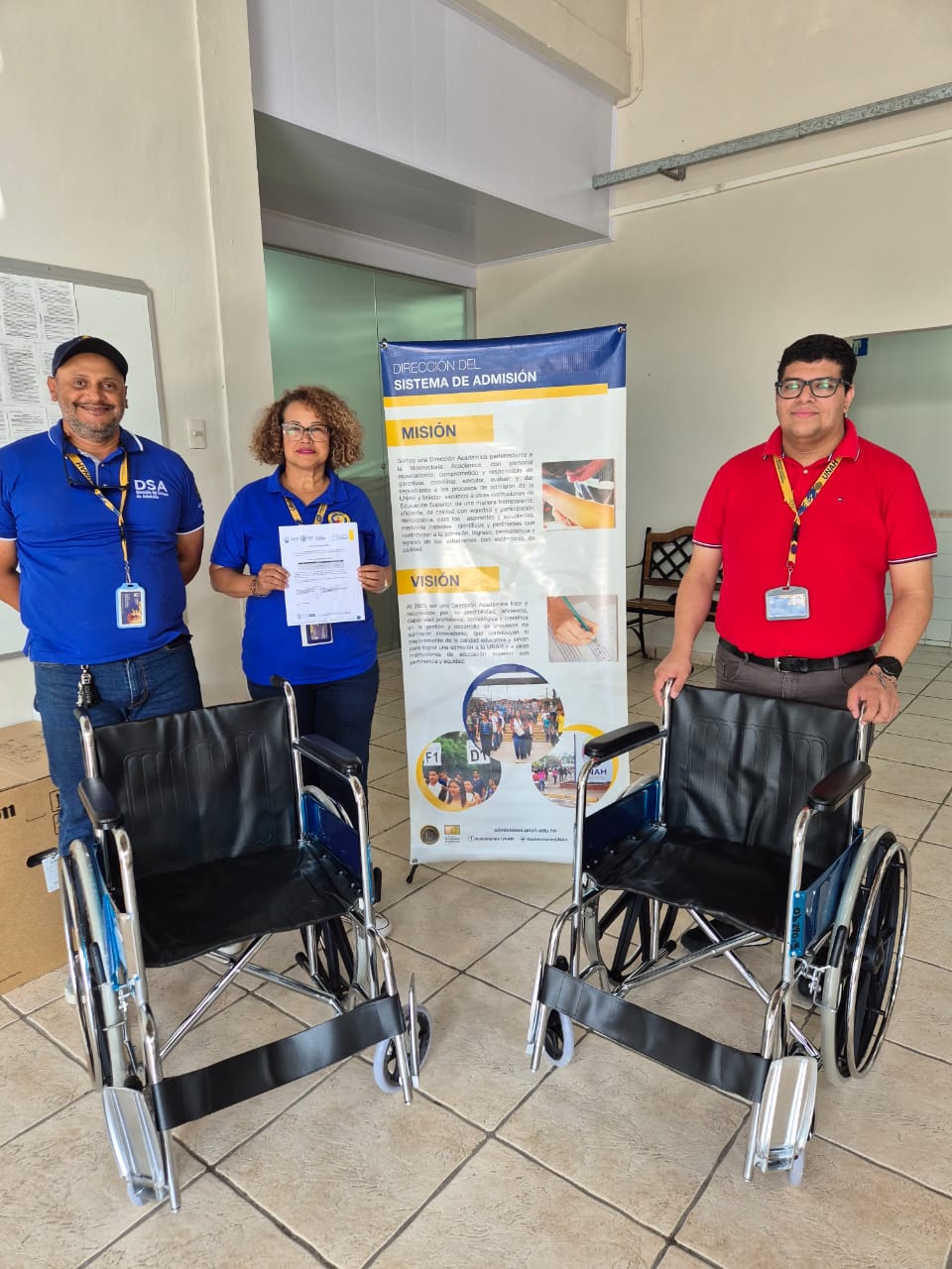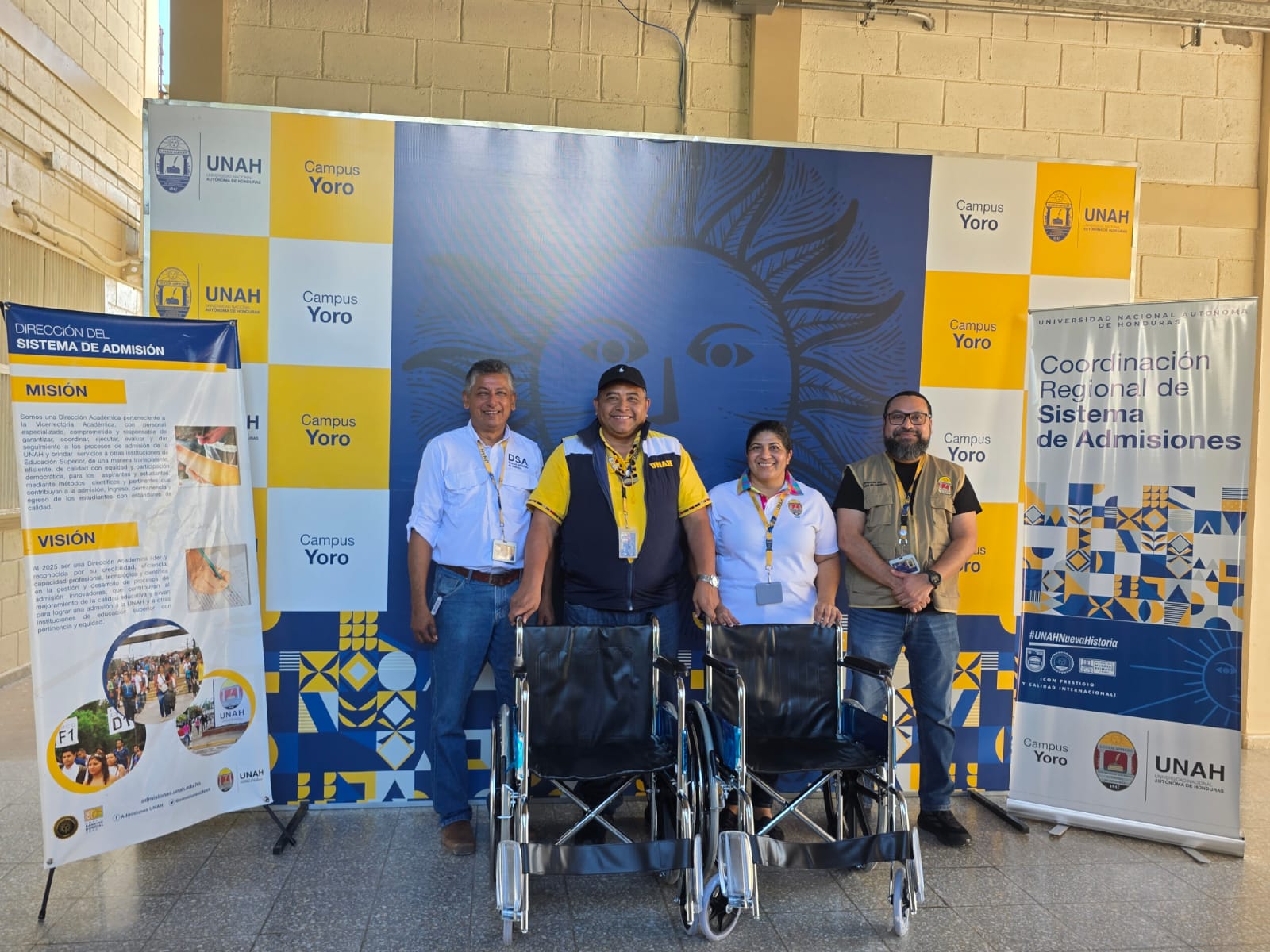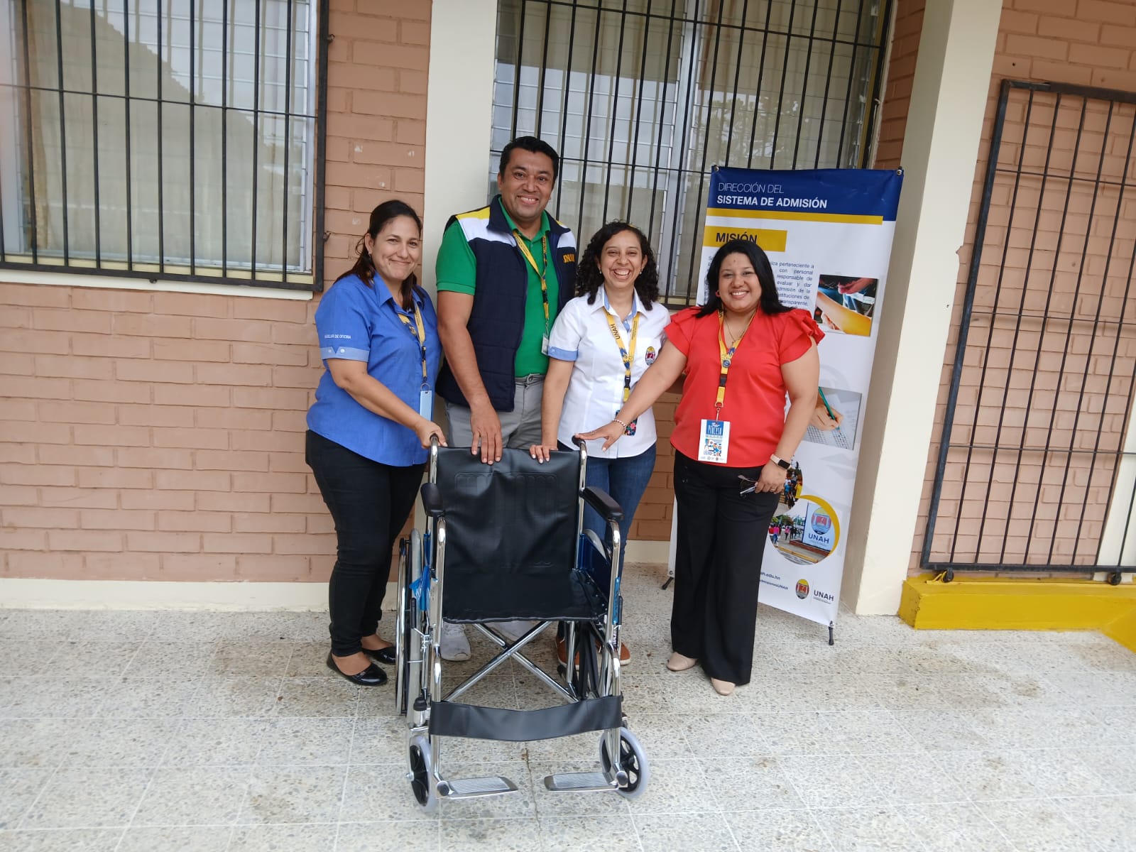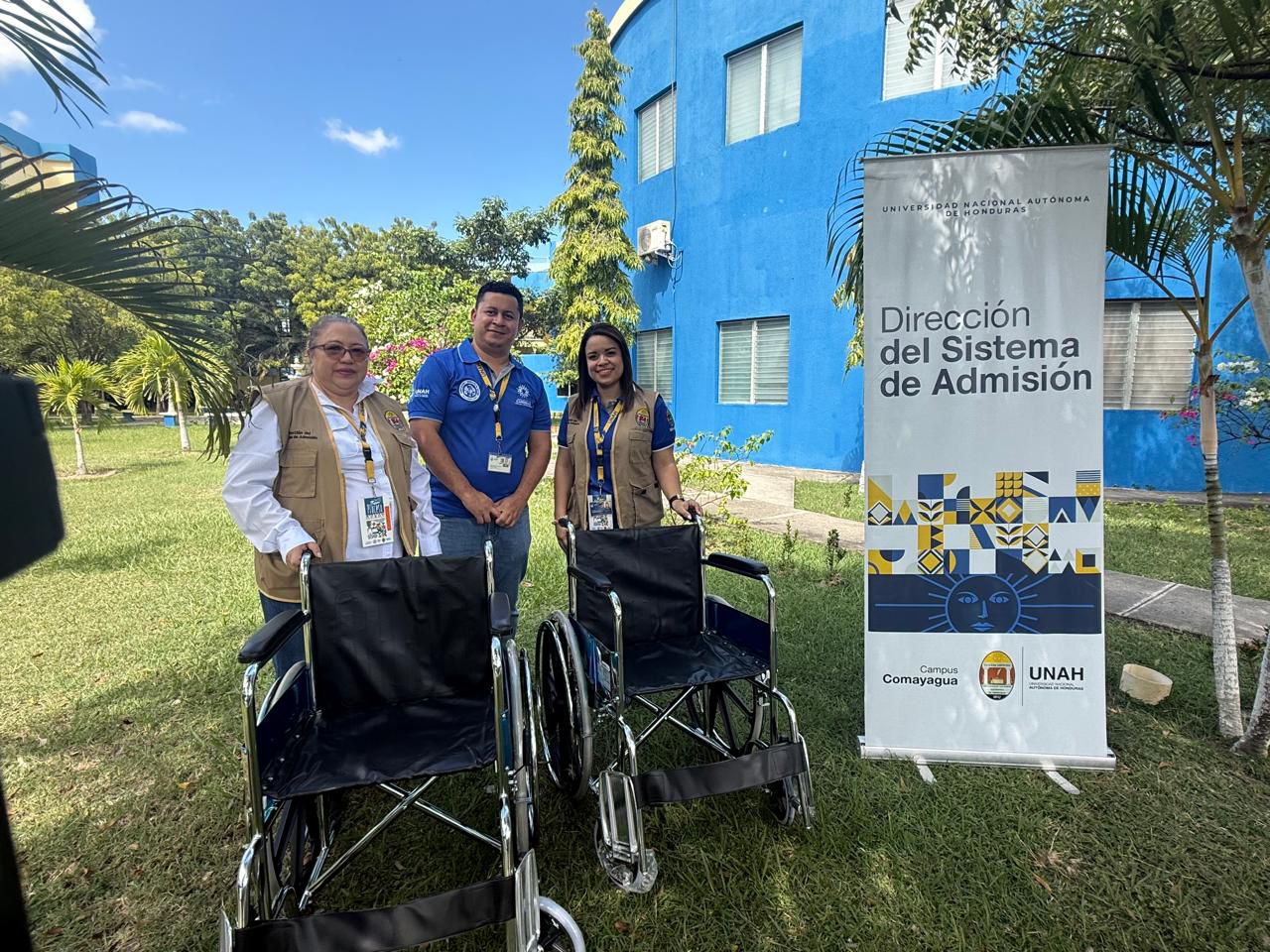En el marco del tercer proceso de admisión, la Universidad Nacional Autónoma de Honduras a través de la Vicerrectoría Académica y la Dirección del Sistema de Admisión, entregó un lote de 30 sillas de ruedas para facilitar la atención de aspirantes que se presentan con alguna discapacidad durante la aplicación de la Prueba Hondureña Universitaria de Medición Académica (PHUMA).