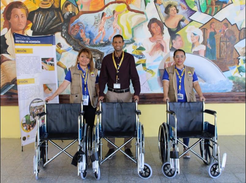 Las sillas de ruedas fueron entregadas por el responsable de sede de la Dirección del Sistema de Admisión, quien se trasladó a cada campus para la supervisar el proceso. Las sillas fueron recibidas por el director de cada campus, junto con el Coordinador Regional de Admisión. El objetivo de esta dotación es fortalecer las oficinas de admisión y los campus regionales a nivel nacional, con el fin de brindar una mejor atención a los aspirantes que presentan alguna discapacidad o limitación que les impida movilizarse adecuadamente dentro de los centros durante la realización de la prueba.