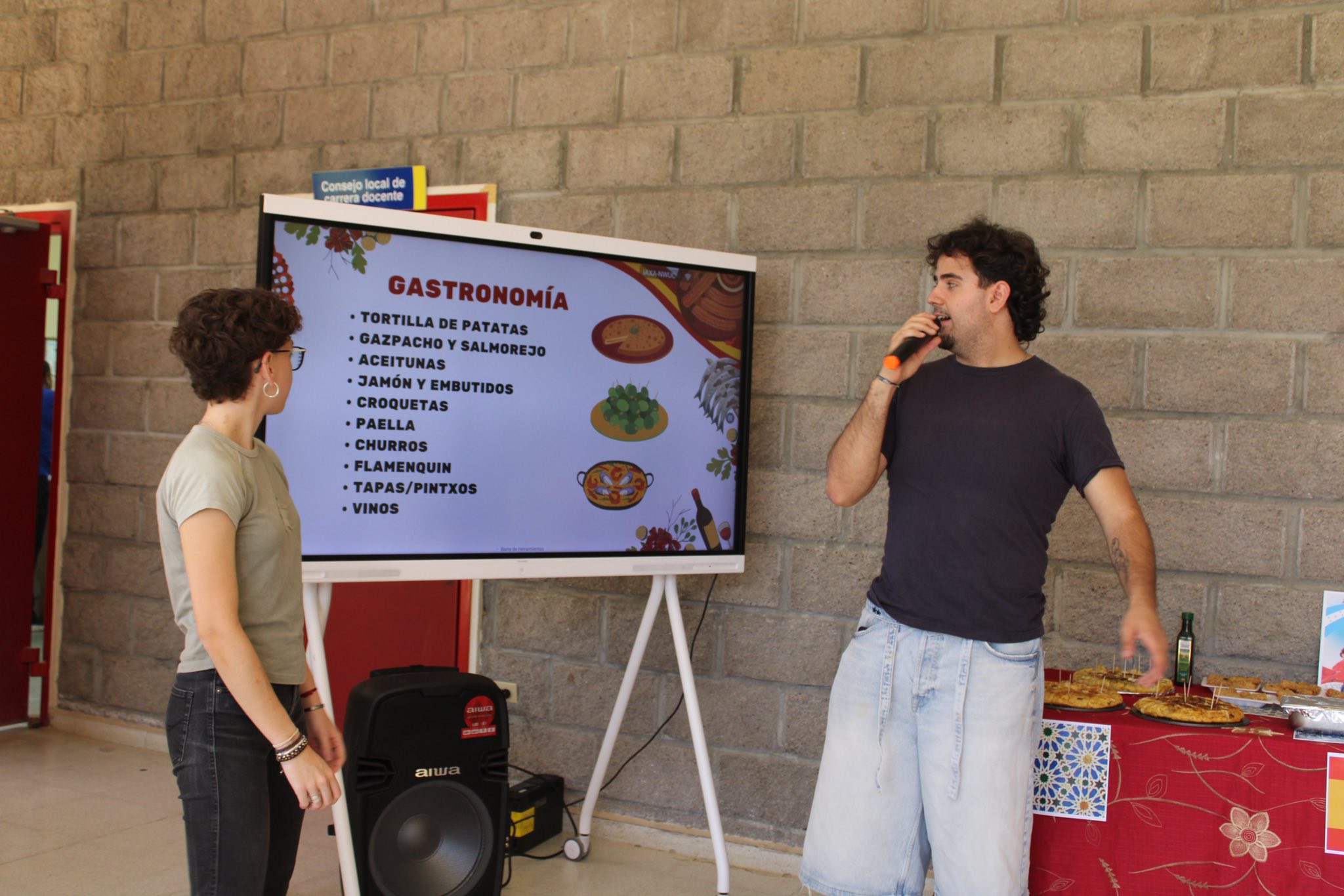 Los voluntarios, Jara y Jesús compartieron una presentación sobre las tradiciones, comidas típicas y costumbres de España, lo que permitió un intercambio directo y enriquecedor de vivencias culturales. Ambos se mostraron emocionados y agradecidos por la hospitalidad recibida. Por parte de los voluntarios, la propuesta gastronómica incluyó tortilla española, croquetas, gazpacho y una selección de quesos, que también fueron explicados y degustados por los asistentes.