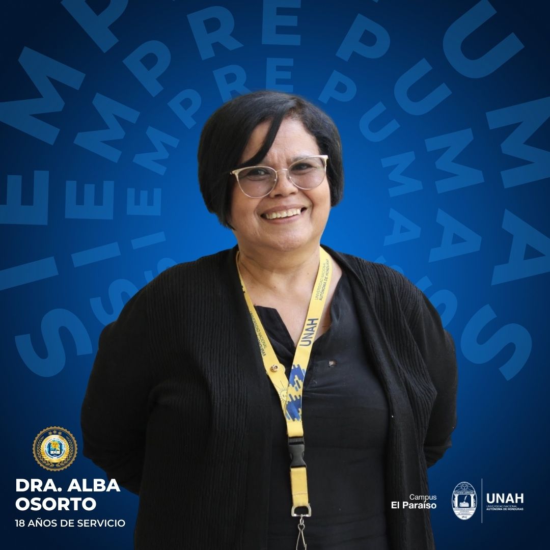 Doctora en Química y Farmacia, Alba Osorto llegó a nuestro Campus El Paraíso un 4 de febrero de 2008. Desde entonces, su nombre quedó ligado a generaciones de estudiantes que encontraron en ella no solo a una profesora apasionada por su disciplina, sino a una persona genuinamente interesada en quienes tenía frente a sí. Su vocación por la docencia nació mucho antes del aula universitaria. Proveniente de una familia de cinco hermanos, todos maestros, fue testigo desde pequeña de prácticas pedagógicas y materiales didácticos que despertaron en ella el amor por enseñar. Aunque inicialmente su familia deseaba que siguiera otro camino, logró abrirse paso hacia el magisterio, convencida de que enseñar no era solo una profesión, sino una forma de vida.