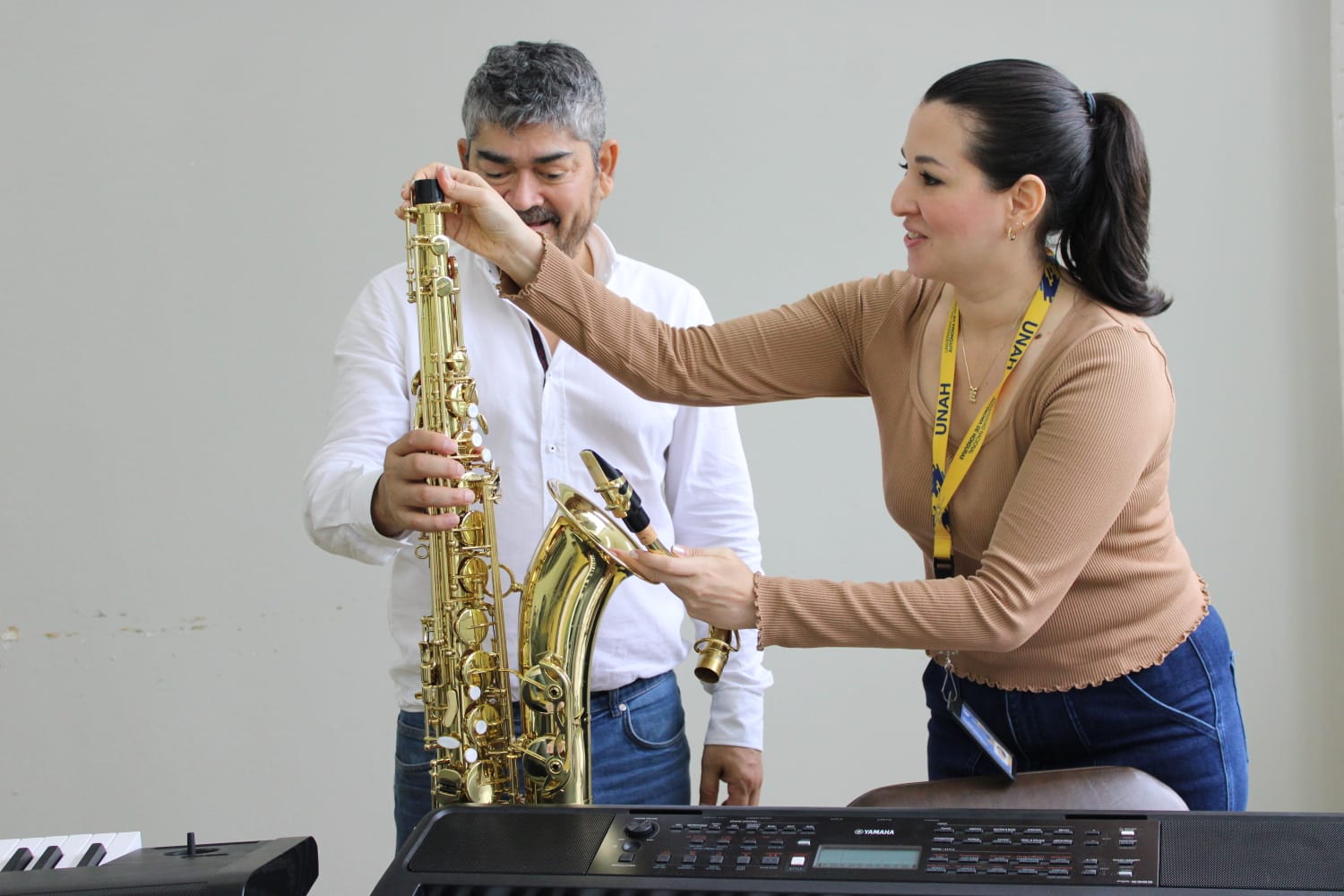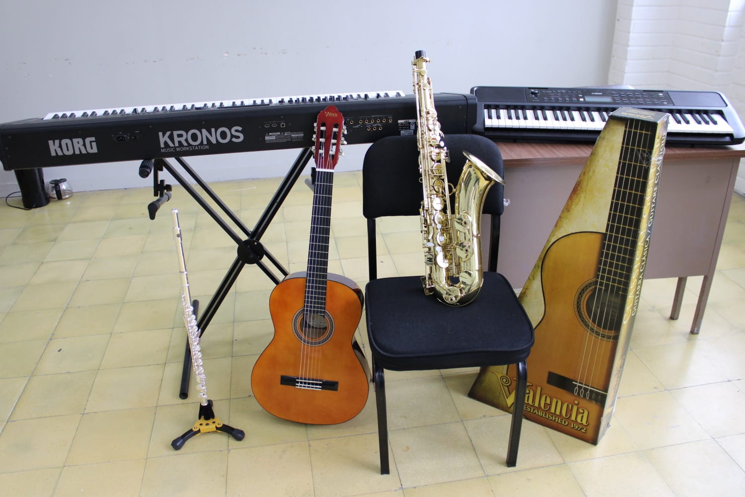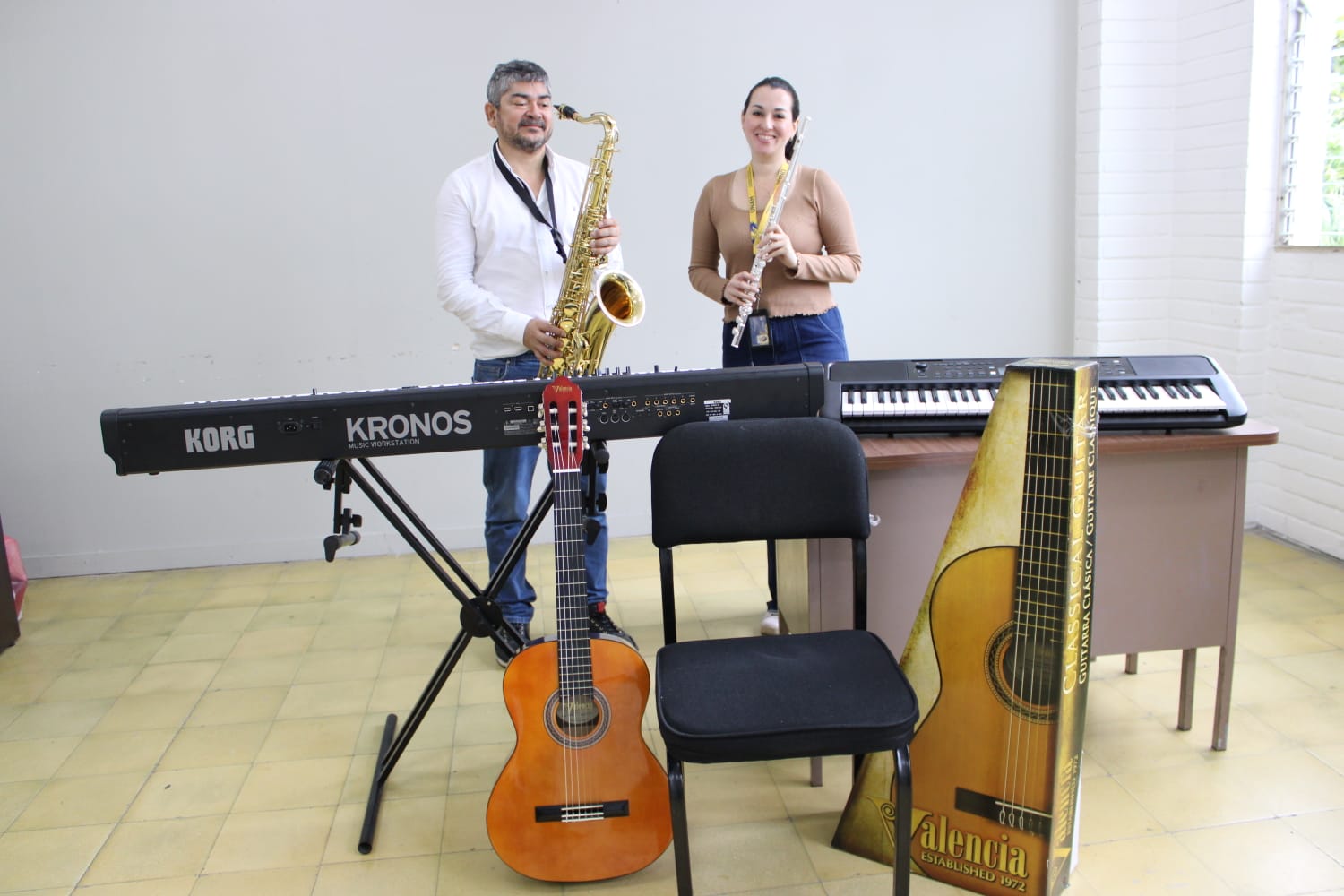 Los instrumentos entregados saxofón, teclados, guitarras acústicas, contrabajo, flauta traversa y una batería, que serán utilizados con fines académicos y artísticos.