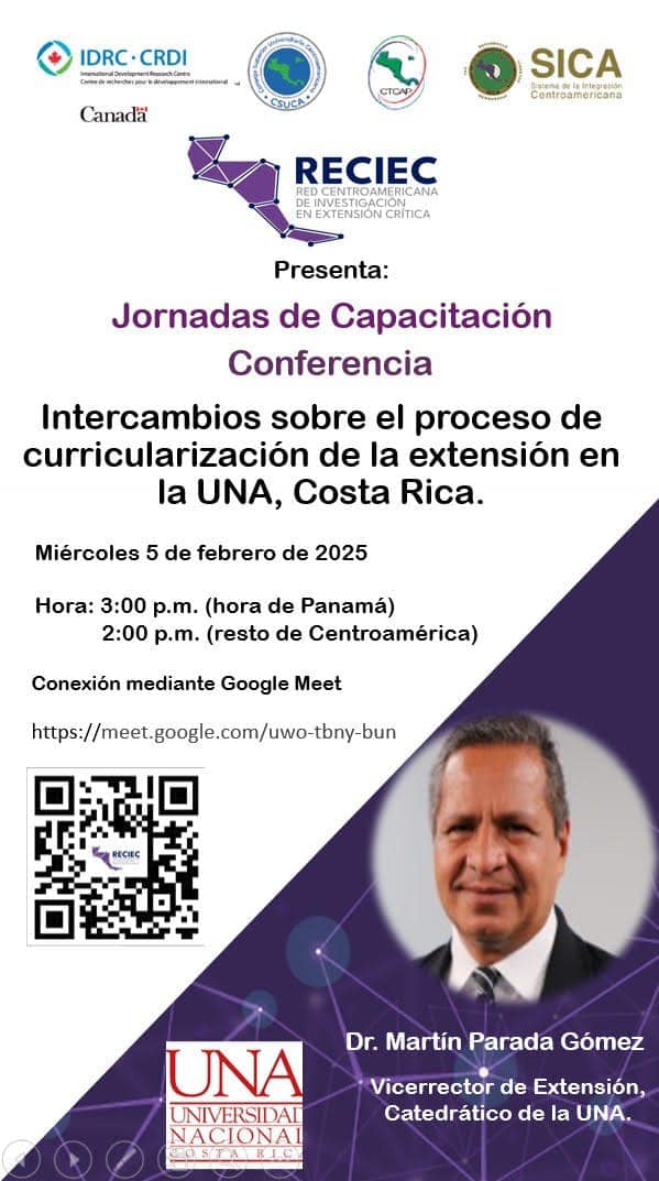 Desde la Vicerrectoría Académica, a través de la Dirección de Vinculación Universidad-Sociedad, nos complace extenderles una cordial invitación a la Jornada de Capacitación organizada por la Red Centroamericana de Investigación en Extensión Crítica (RECIEC).